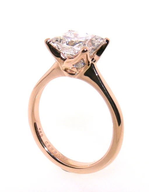 18ct rose gold princess and round brilliant cut diamond solitaire ring. Featuring 2.59ct princess cut diamond and 4=0.15ct round brilliant cut diamonds. Ring size L . Item weight is 4.87 grams.