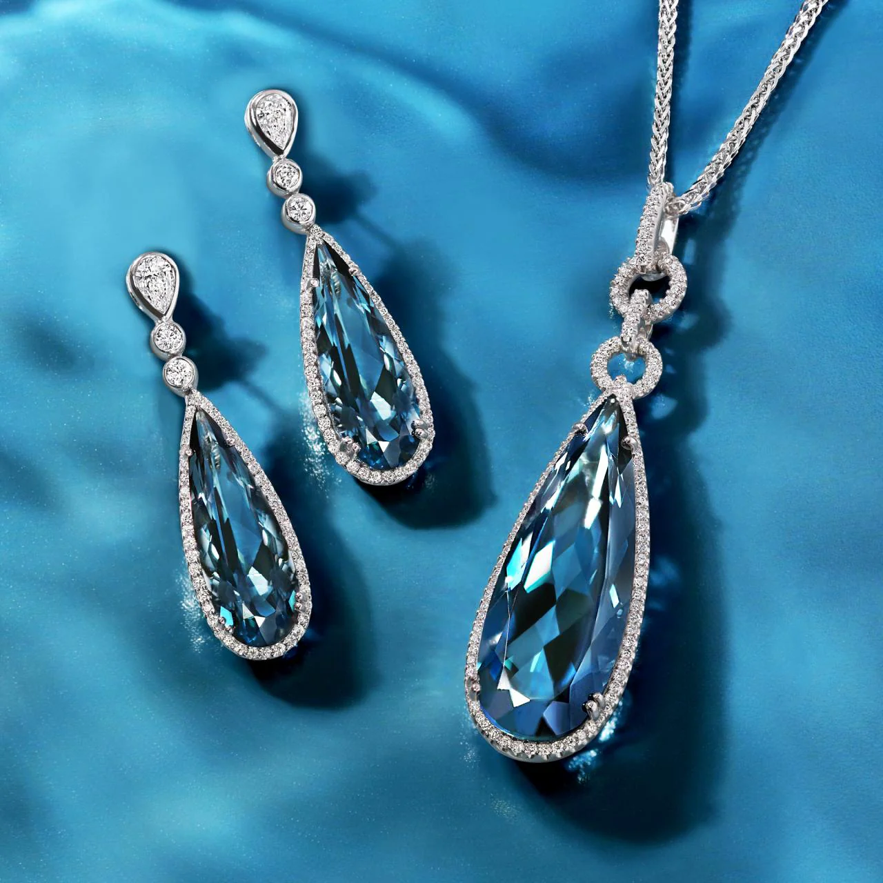 18ct white gold 18.28ct pear cut London blue topaz and diamond drop pendant