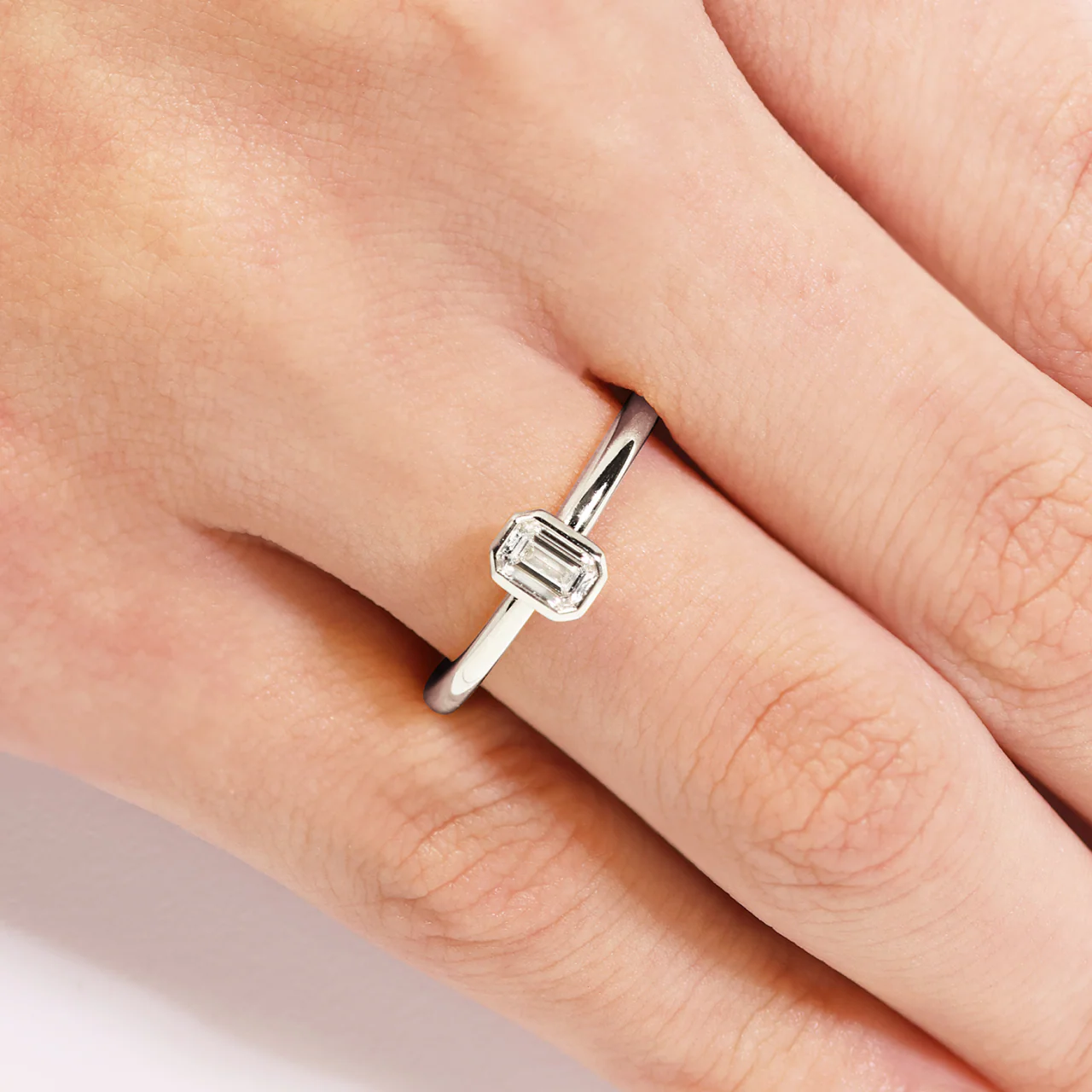 18ct white gold 0.32ct DEF VS bezel set emerald cut diamond solitaire engagement ring