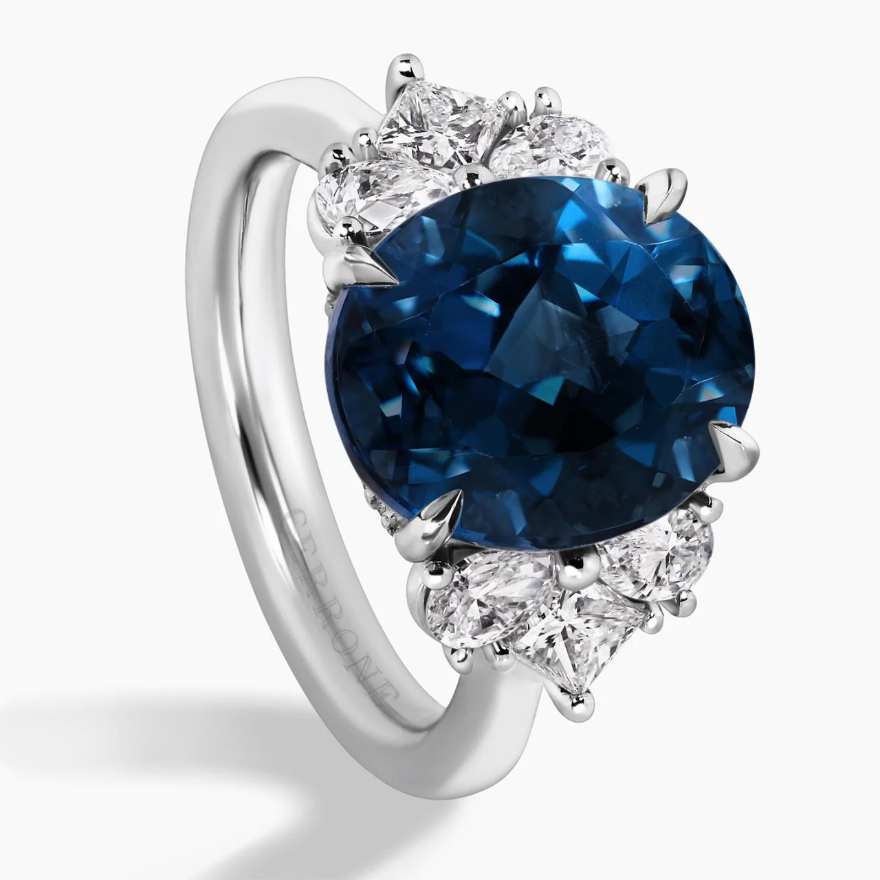 18ct white gold 6.09ct oval shape London blue topaz and diamond ring with pear, princess and round brilliant cut diamonds