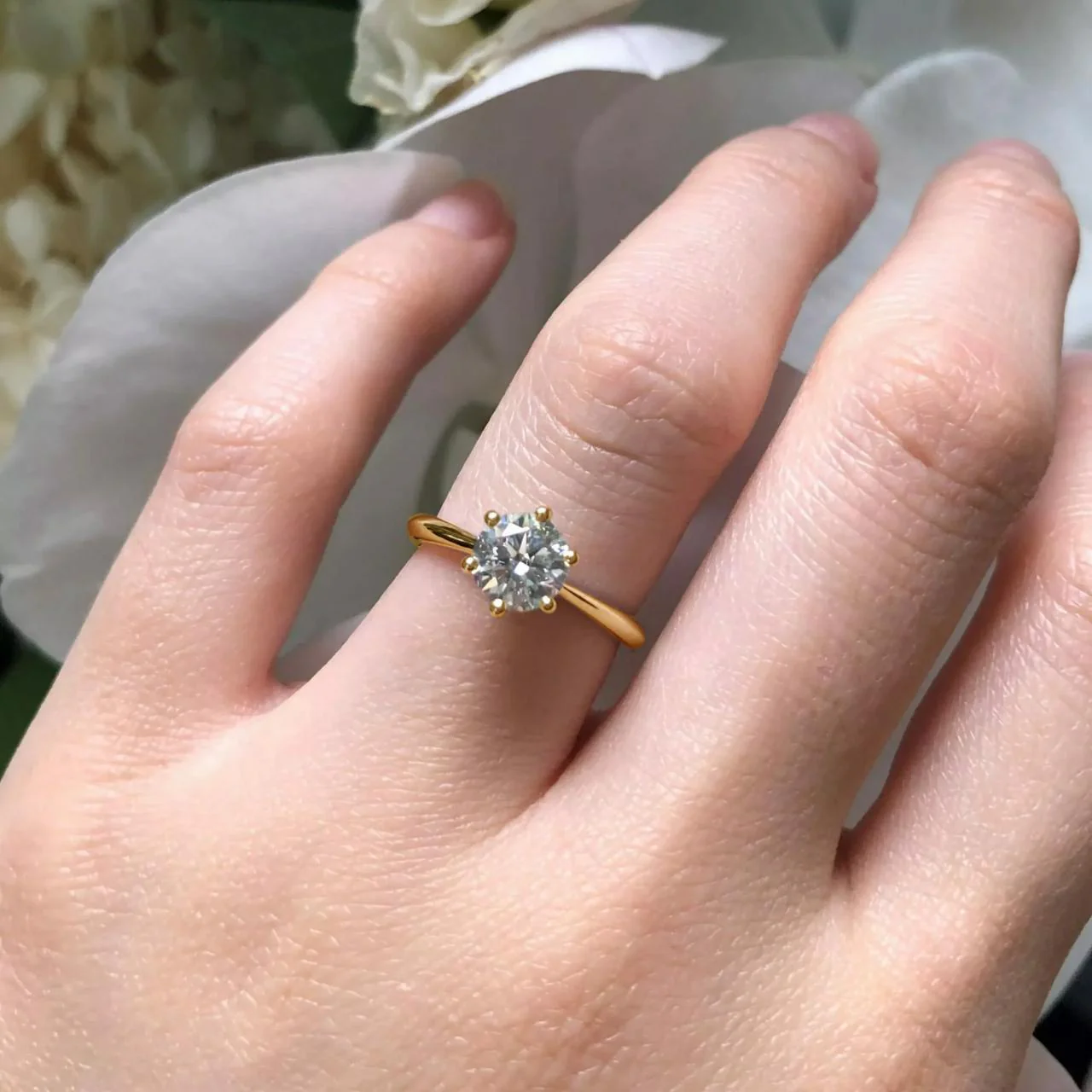 18ct yellow gold diamond solitaire engagement ring features 1.01ct E VVS2 round brilliant cut lab grown ring in a six claw setting. Item weight is 4.52 grams. Ring size M. IGI Report 520286365