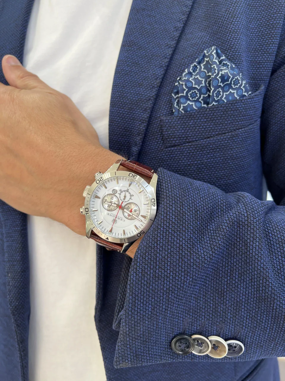 Cerrone 50th Anniversary chronograph ‘Marrone’ watch features brown leather band with white stitching from the Venezia Collection. Diameter 44mm